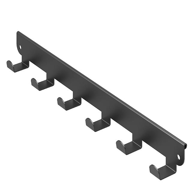 Конструкция представляет собой металлическую планку с 6 или 8 крючками (в зависимости от модели), которая навешивается на внешнюю боковую поверхность кронштейна в гардеробной системе ПРАКТИК HOME.