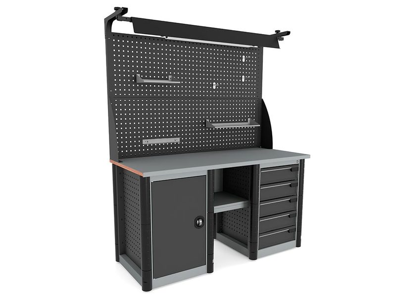 - Боковые перфорированные стенки тумбы и опоры позволяют размещать на них различные стандартные аксессуары